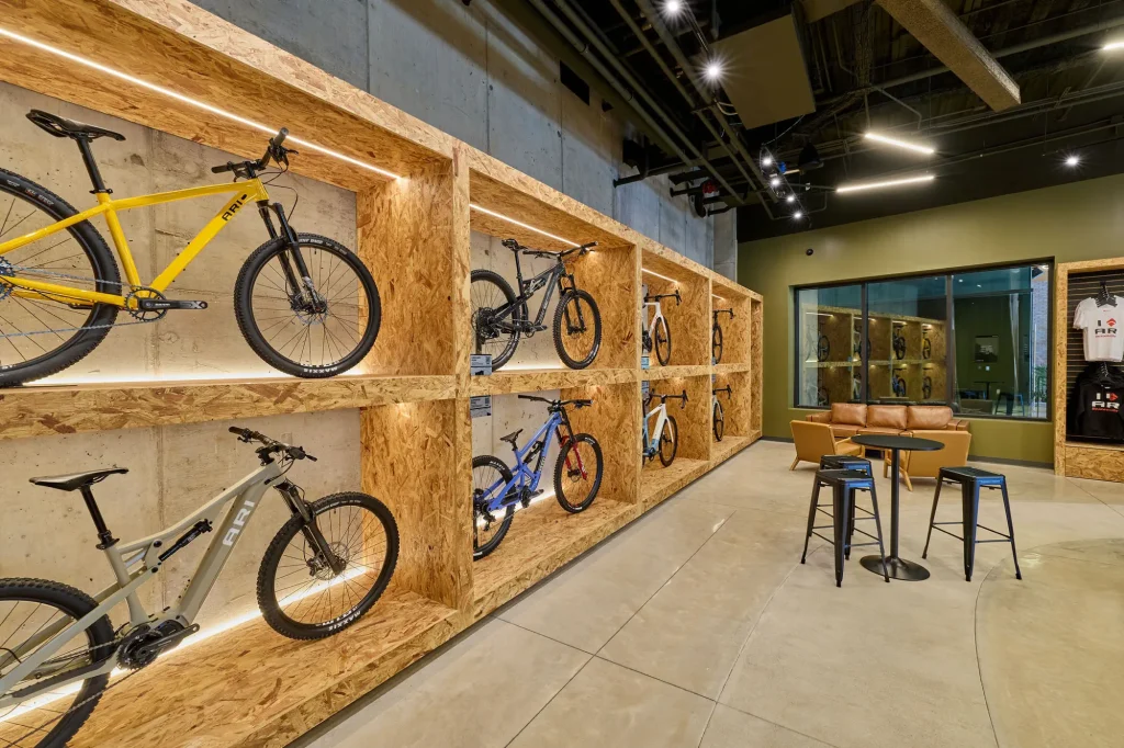 Inspired by the craftsmanship of mountain bike trail builders, commonly available materials are thoughtfully detailed and assembled to elevate the environment with custom touches and authentic character. The showroom balances functionality with a refined aesthetic, creating an inviting experience that celebrates the ARI brand, the natural landscape that influences it, and the community that gathers around it.