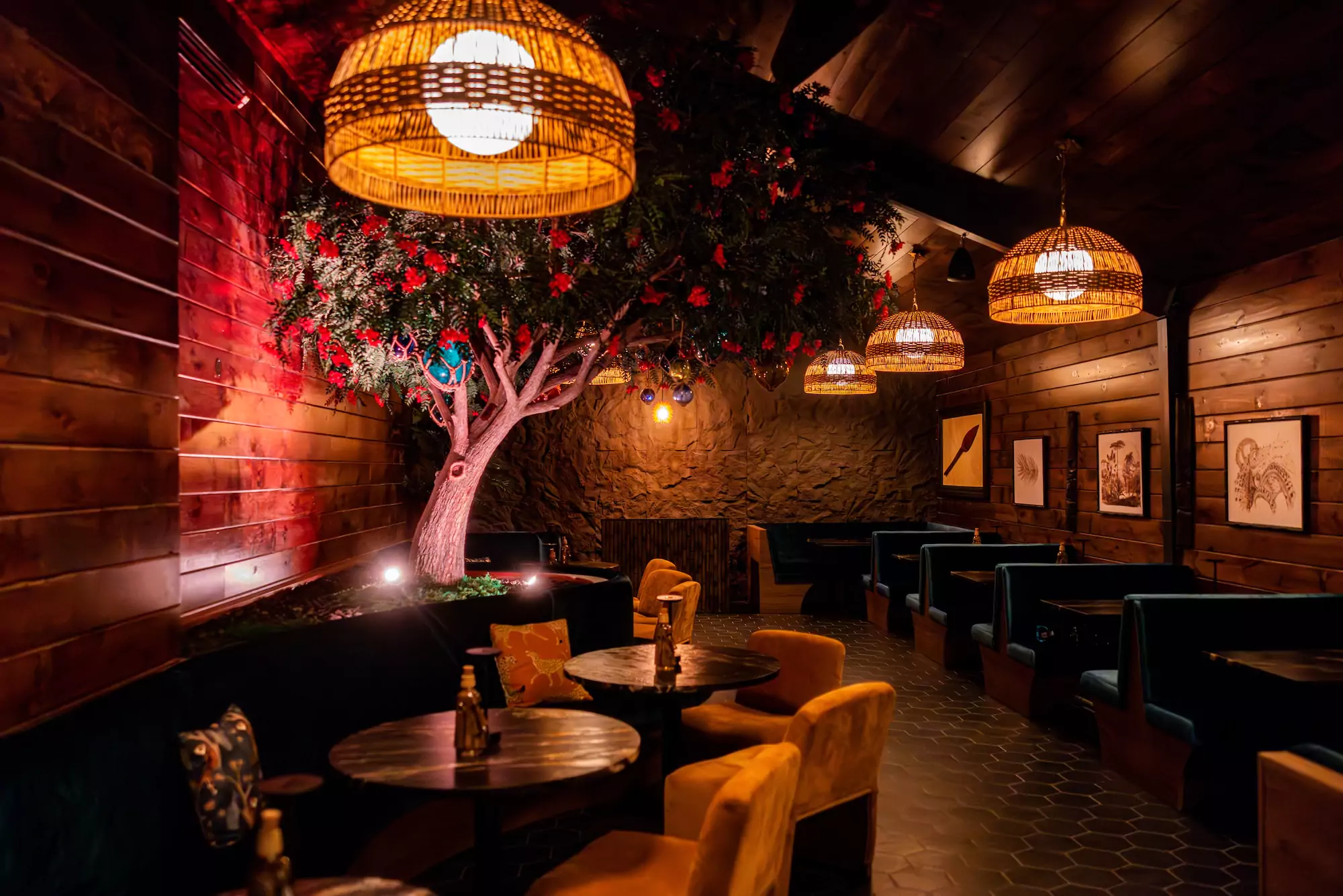 “Moon Jungle Tiki Bar Speakeasy” These are the initial descriptor words for the food and beverage concept that is now, Callisto. A transcending take on the tiki theme, Callisto transports its guests through a detailed and immersive hospitality experience unlike any other in the region. The design integrates organic shapes, curves, tropical greenery, natural wood, bamboo, and other natural elements to establish a luscious, moody speakeasy atmosphere where guests can escape into a tasteful tropical getaway.