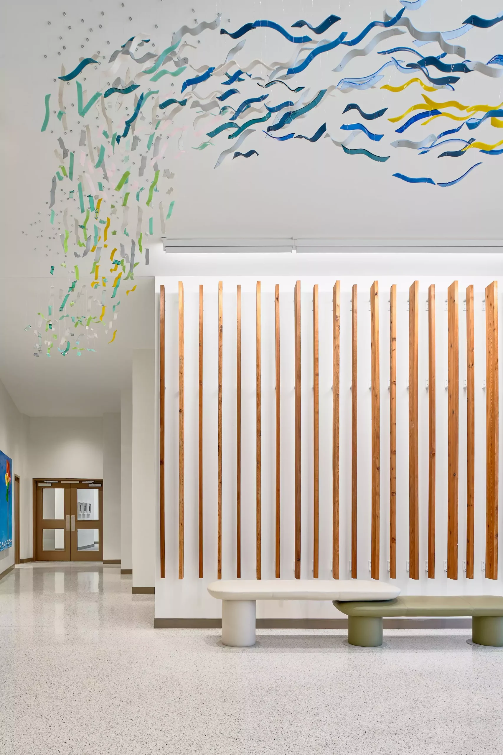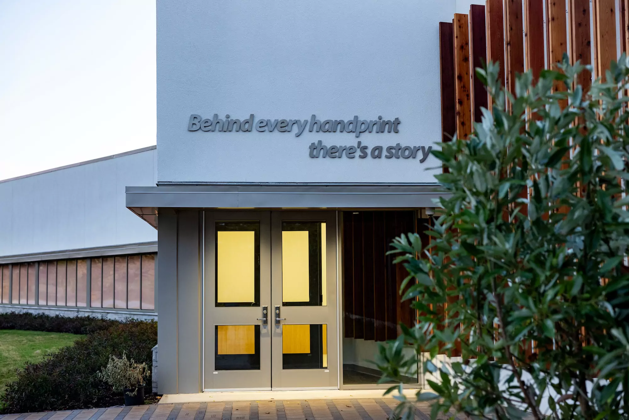 Children’s Safety Center of Washington County As the sun sets, the center’s façade transforms into a radiant tapestry of handprints, an inclusive and symbolic testament to those who came before and a beacon of solidarity for those currently seeking recovery. The design team elongated the front façade along Gene George Boulevard, creating a compassionate embrace with a subtle angle at the main entry.
