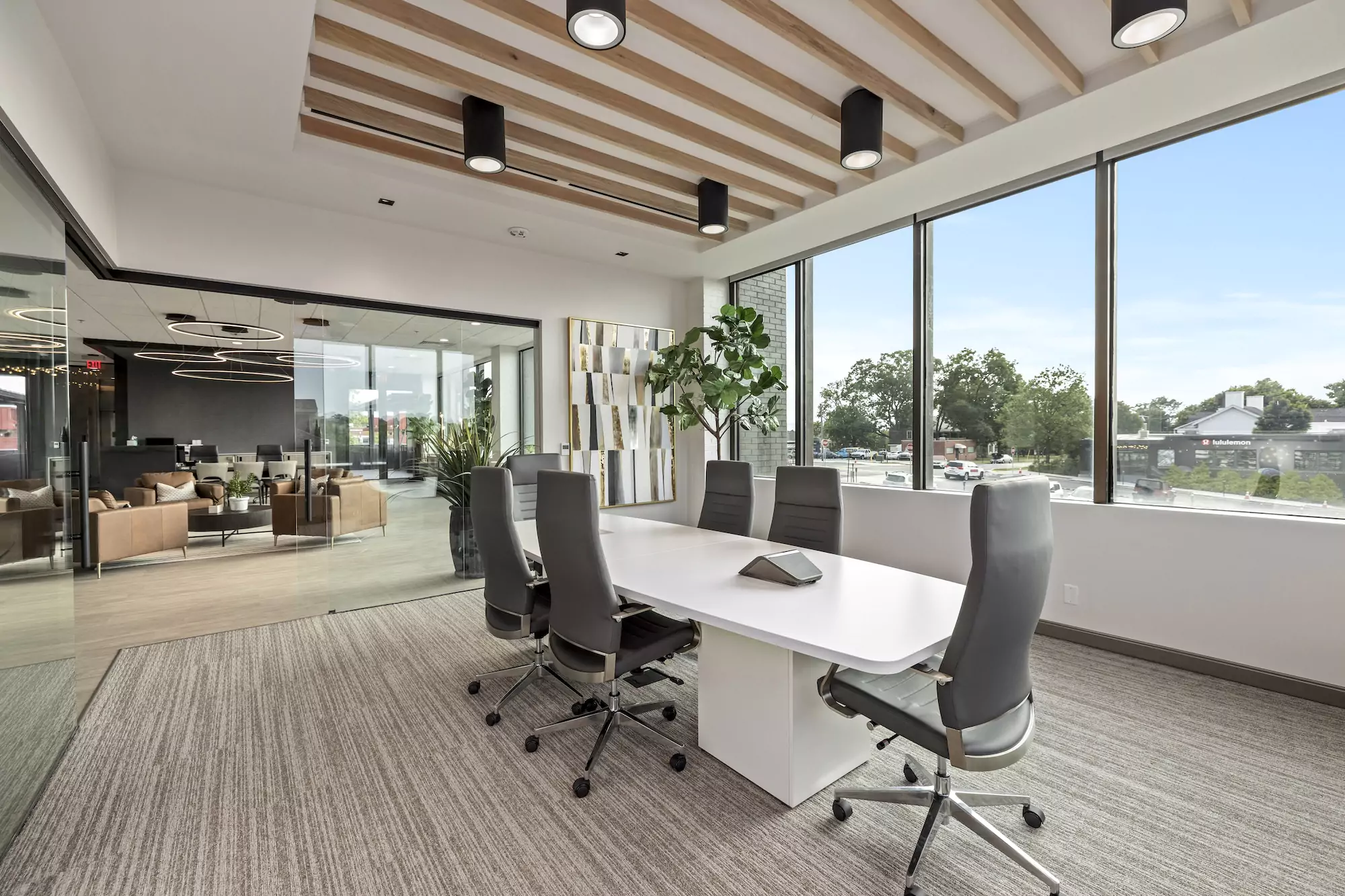 Encore Bank‘s office and teller space in downtown Fayetteville was designed to transform the traditional banking experience by crafting an open, approachable environment. The goal was to foster a more engaging and personable interaction between clients and employees. The space features an inviting lounge and reception area, using modern design elements to create a comfortable and welcoming atmosphere.