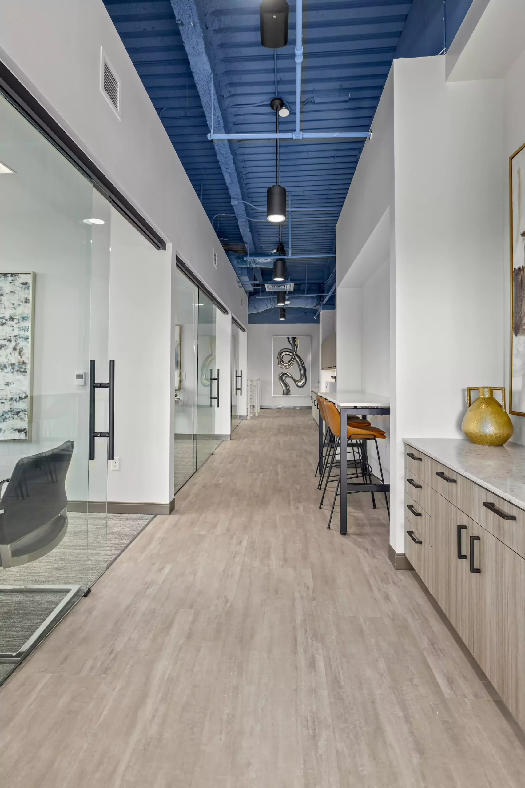 A cove light washes the existing concrete foundation walls, serving as a backdrop to the offices. This subtle lighting highlights the raw beauty of the building’s structure, emphasizing the charm of adaptive reuse projects. By showcasing these exposed elements, the design tells a story of transformation—where history meets modern functionality, creating a dynamic and comfortable environment for both staff and clients.